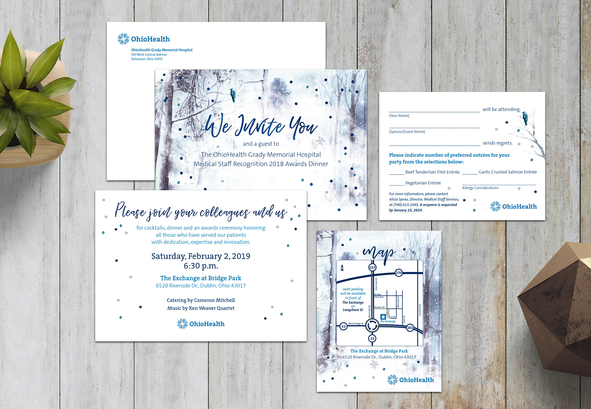 OhioHealth medical staff recognition invite, rsvp, map, and envelope.