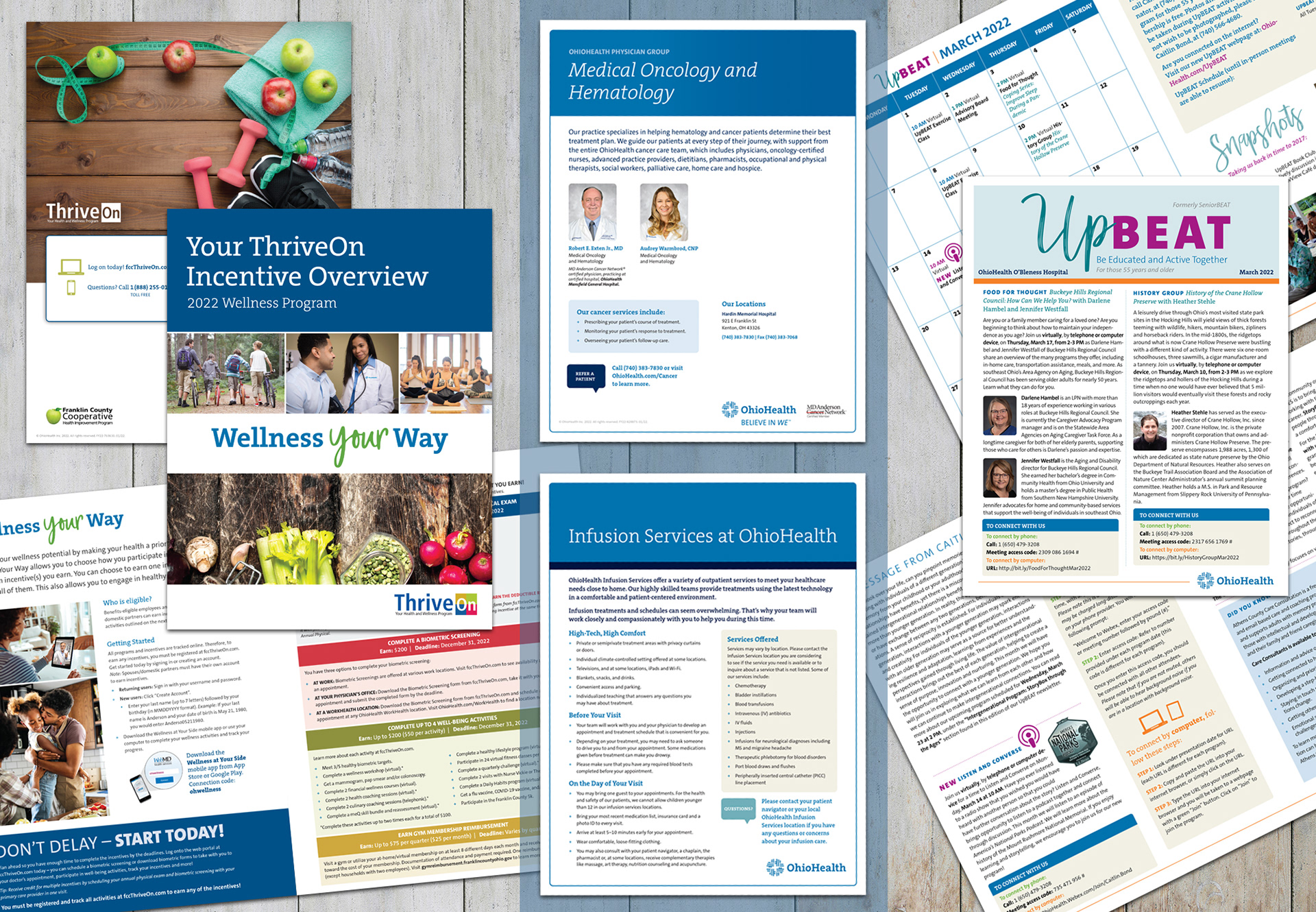 A sampling of OhioHealth printed projects including fliers, a brochure and a newsletter.